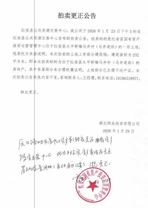 我公司于2026年1月 23日下午3时在红安县公共资源交易中心发布的拍卖公告,拍卖标的是红安县国有资产投资运营管理中心位于红安县太平桥镇马井村(马井道班)的一宗土地。 更正内容如下: 本次拍卖的土地上有部分建筑物,建筑面积为232平方米,即本次拍卖标的为位于红安县太平桥镇马井村(马井道班)的房地产,其中房屋部分未办理权属证明,土地部分已办理不动产证。本次拍卖公告其他内容不变。特此更正。 咨询请联系:王经理 18186318977 湖北顺成拍卖有限公司 2026年1月29日